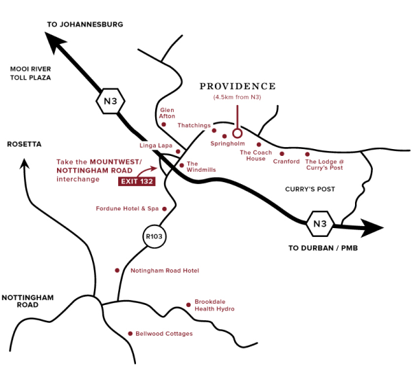 Please take Exit 132 from the N3 Southbound. Turn left past the Petrol Station and the Linga Lapa (with Biltong written on the roof). The road becomes a gravel road proceed straight along it for just over 4kms. You will pass Thatchings guesthouse after 2kms. After another 2kms you will come to Providence on the right hand side.